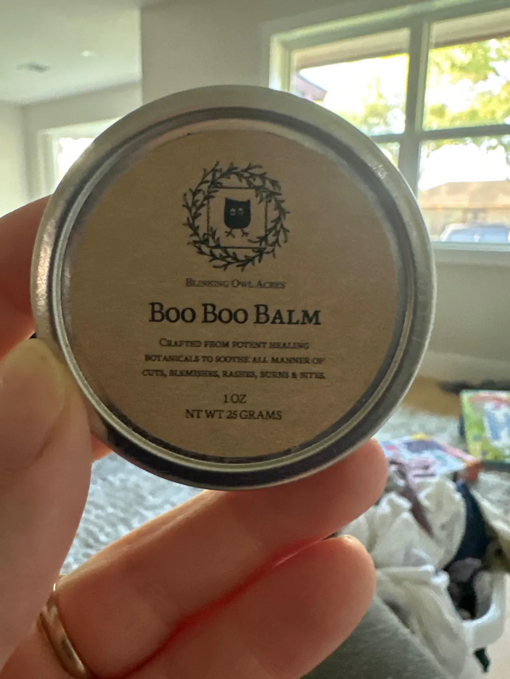BooBoo Balm is an incredible product in a humble little tin! This healing balm comes in handy for almost all topical skin uses. Whether it's to heal a scrape, soothe a burn, calm a rash, nourish chapped lips, or subdue a sting, this balm is up to the task. It even helps with breakouts way better than your typical spot treatment!
